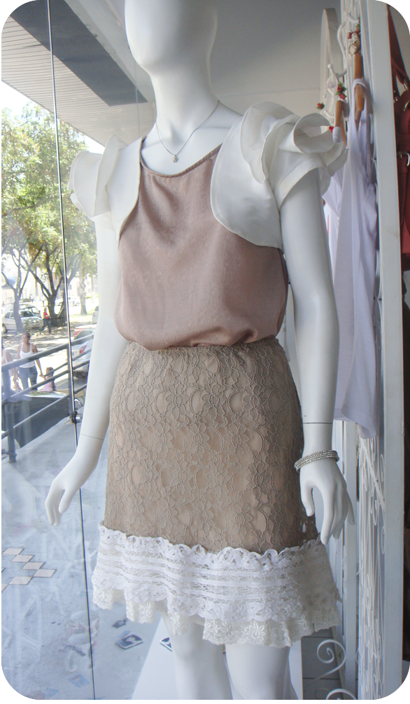 Bolero Frufrulândia da Avohai, blusa Colméia, saia rendada avohai, pulseiras em strass e colar flor prata